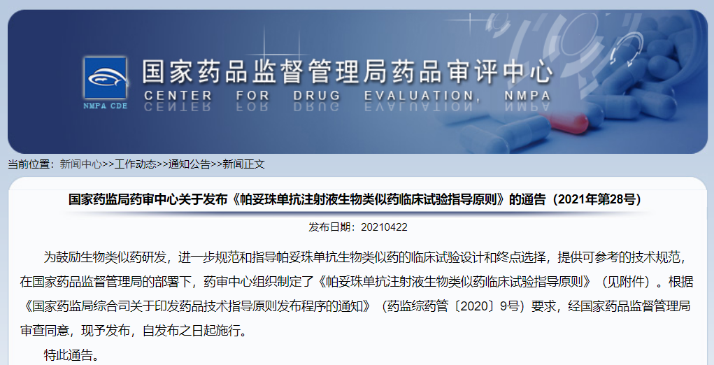 國家藥監(jiān)局藥審中心關(guān)于發(fā)布《帕妥珠單抗注射液生物類似藥臨床試驗指導(dǎo)原則》的通告(2021年第28號)