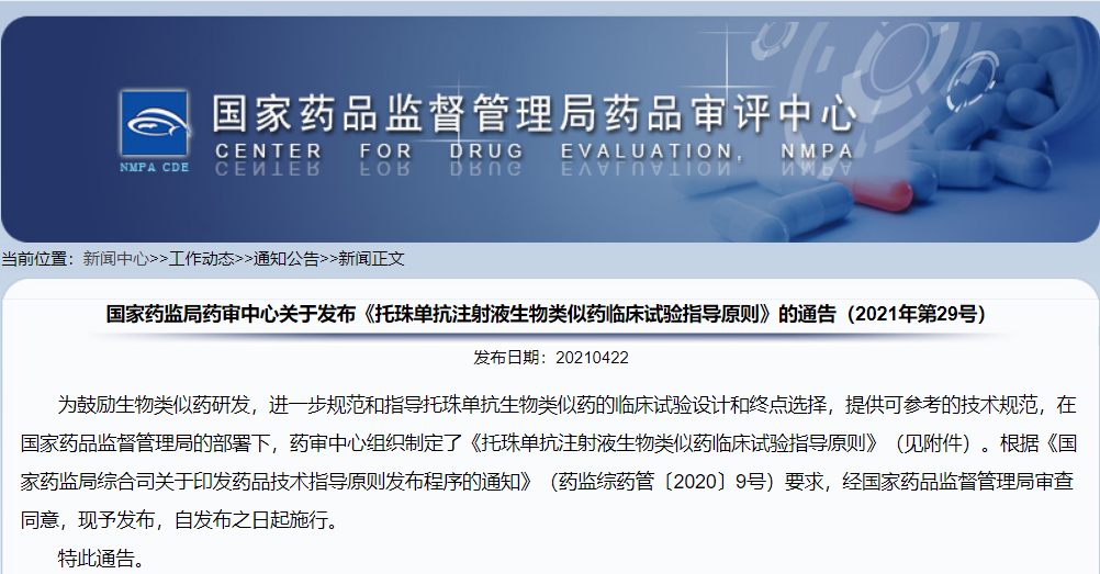國家藥監(jiān)局藥審中心關(guān)于發(fā)布《托珠單抗注射液生物類似藥臨床試驗指導(dǎo)原則》的通告(2021年第29號)