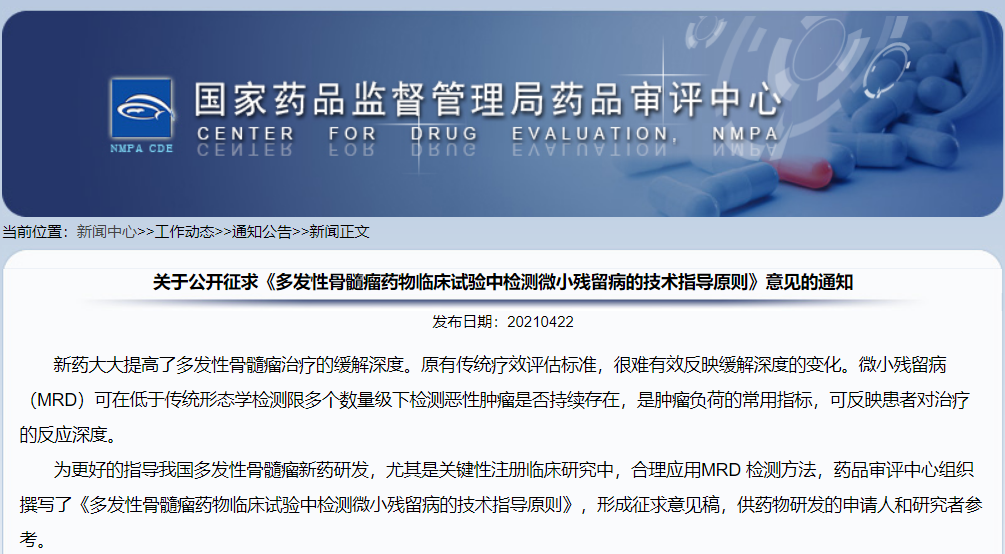 關(guān)于公開征求《多發(fā)性骨髓瘤藥物臨床試驗中檢測微小殘留病的技術(shù)指導(dǎo)原則》意見的通知