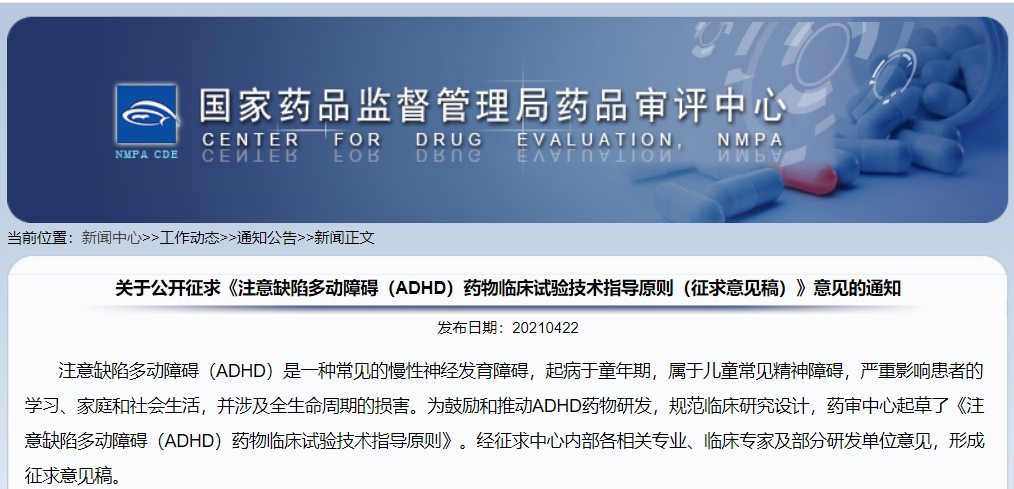 關(guān)于公開征求《注意缺陷多動障礙(ADHD)藥物臨床試驗技術(shù)指導(dǎo)原則(征求意見稿)》意見的通知