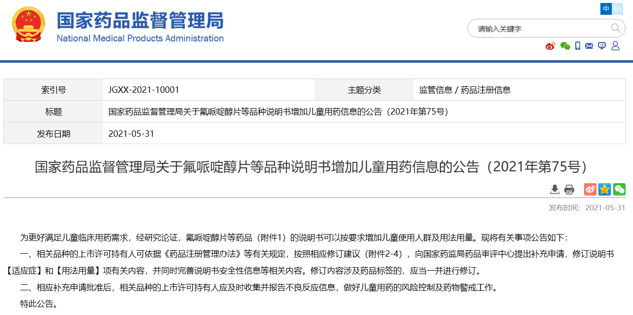 國家藥品監(jiān)督管理局關(guān)于氟哌啶醇片等品種說明書增加兒童用藥信息的公告(2021年第75號)