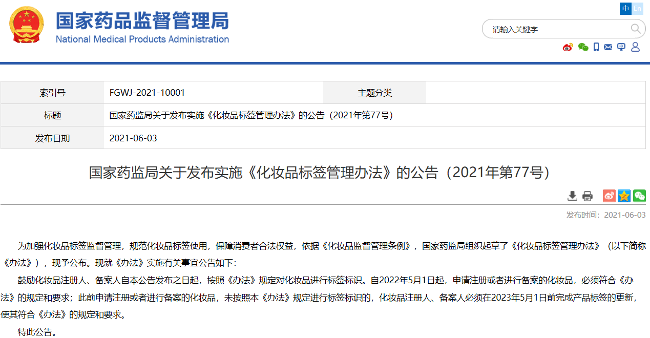 國家藥監(jiān)局關(guān)于發(fā)布實施《化妝品標(biāo)簽管理辦法》的公告(2021年第77號)