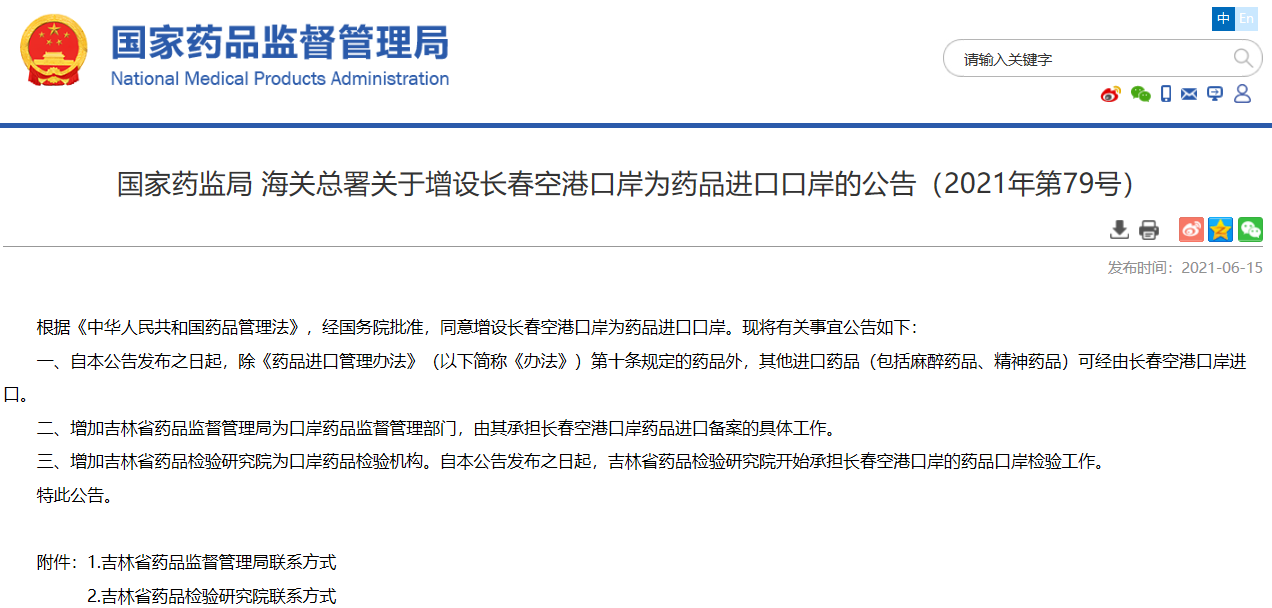 國(guó)家藥監(jiān)局 海關(guān)總署關(guān)于增設(shè)長(zhǎng)春空港口岸為藥品進(jìn)口口岸的公告(2021年第79號(hào))