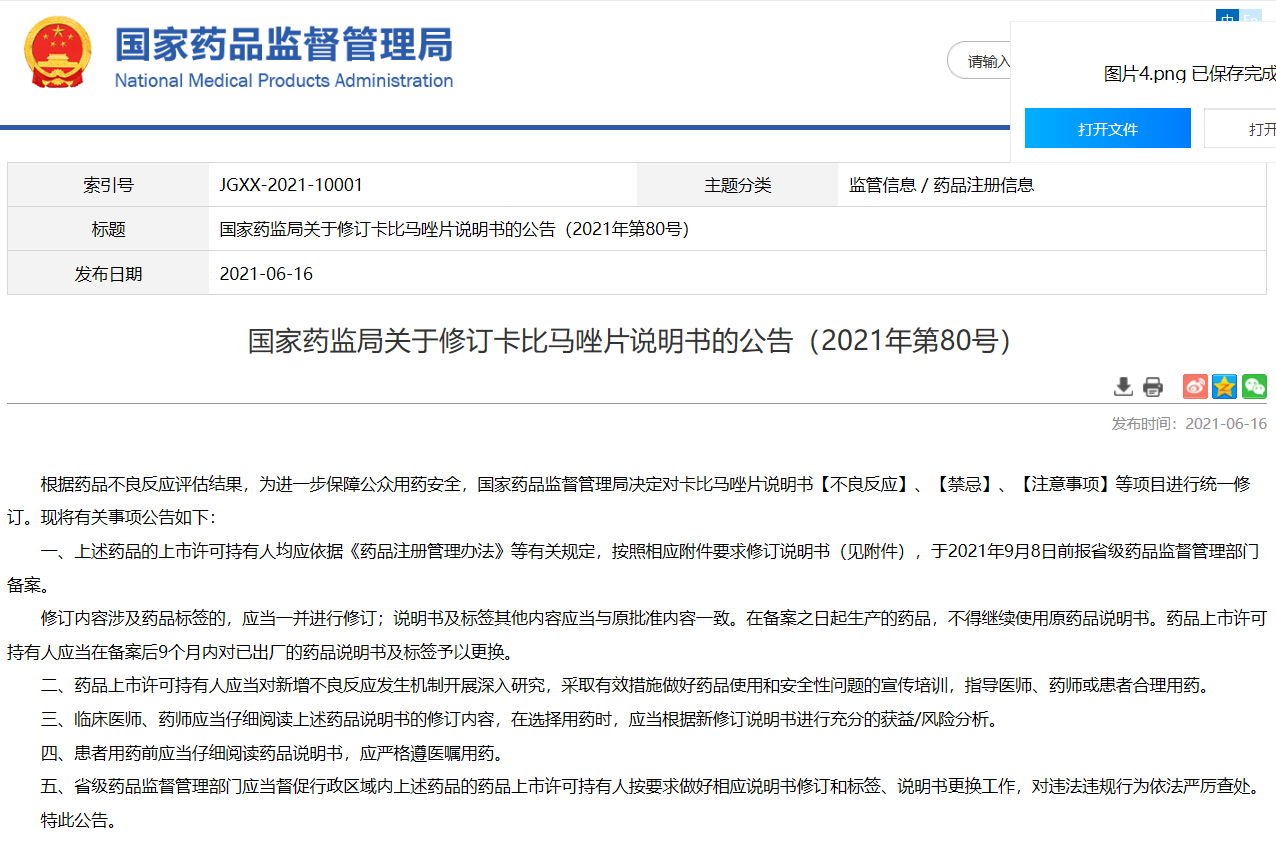 國(guó)家藥監(jiān)局關(guān)于修訂卡比馬唑片說(shuō)明書的公告(2021年第80號(hào))