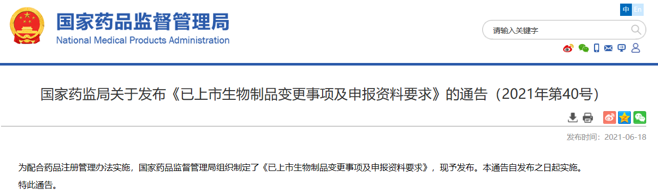 國(guó)家藥監(jiān)局關(guān)于發(fā)布《已上市生物制品變更事項(xiàng)及申報(bào)資料要求》的通告(2021年第40號(hào))