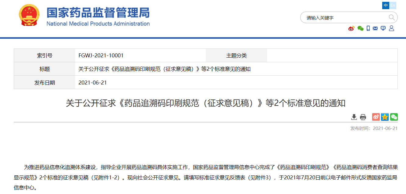 關(guān)于公開(kāi)征求《藥品追溯碼印刷規(guī)范(征求意見(jiàn)稿)》等2個(gè)標(biāo)準(zhǔn)意見(jiàn)的通知