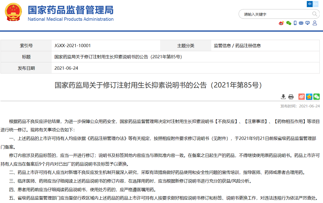 國(guó)家藥監(jiān)局關(guān)于修訂注射用生長(zhǎng)抑素說(shuō)明書(shū)的公告(2021年第85號(hào))