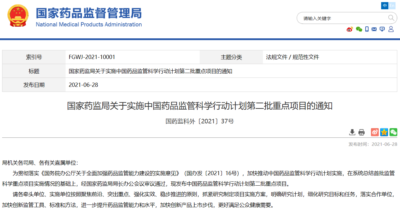 關(guān)于實(shí)施中國(guó)藥品監(jiān)管科學(xué)行動(dòng)計(jì)劃第二批重點(diǎn)項(xiàng)目的通知