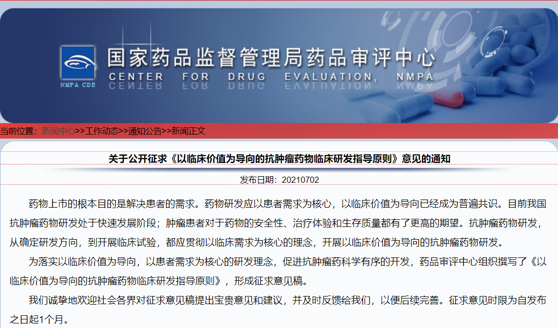 關(guān)于公開征求《以臨床價(jià)值為導(dǎo)向的抗腫瘤藥物臨床研發(fā)指導(dǎo)原則》意見的通知