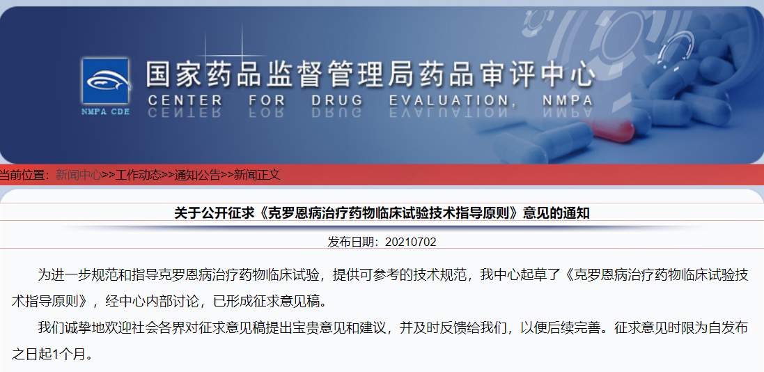 關(guān)于公開征求《克羅恩病治療藥物臨床試驗(yàn)技術(shù)指導(dǎo)原則》意見的通知