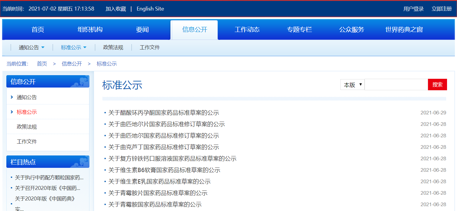 本周醋酸環(huán)丙孕酮、復(fù)方鋅鐵鈣口服溶液、維生素B6軟膏、維生素E乳、青霉胺片、青霉胺國(guó)家藥品標(biāo)準(zhǔn)草案公示;曲匹地爾、曲匹地爾片、曲克蘆丁國(guó)家藥品標(biāo)準(zhǔn)修訂草案公示。