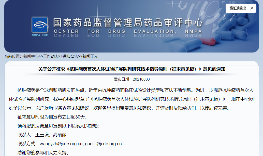 關(guān)于公開征求《抗腫瘤藥首次人體試驗(yàn)擴(kuò)展隊(duì)列研究技術(shù)指導(dǎo)原則(征求意見稿)》意見的通知