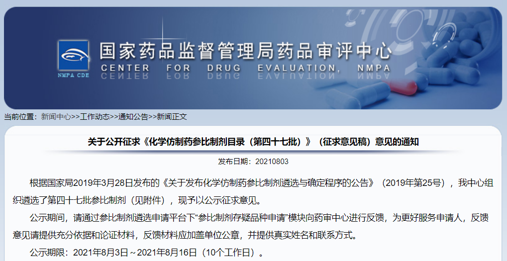 關(guān)于公開征求《化學(xué)仿制藥參比制劑目錄(第四十七批)》(征求意見稿)意見的通知