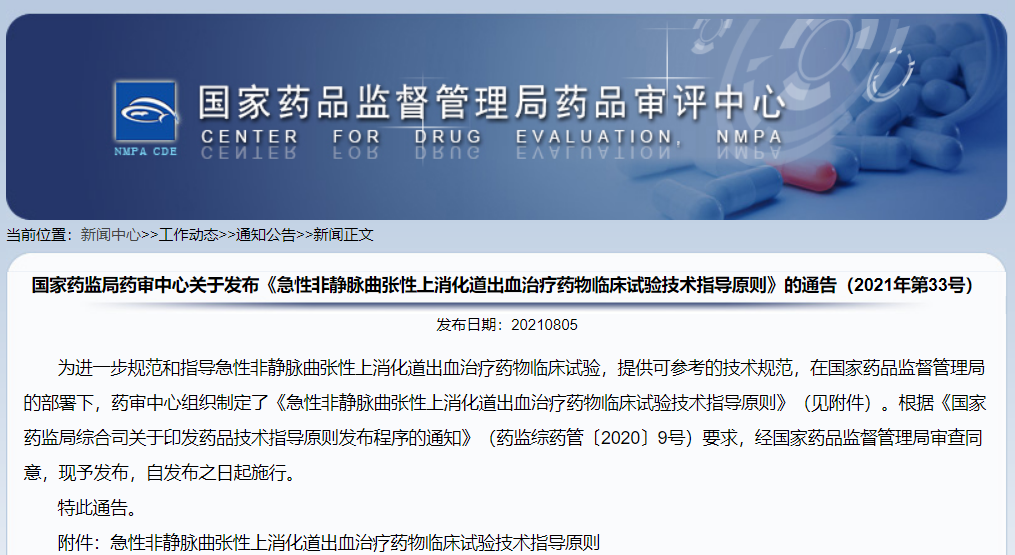 關(guān)于發(fā)布《急性非靜脈曲張性上消化道出血治療藥物臨床試驗(yàn)技術(shù)指導(dǎo)原則》的通告(2021年第33號(hào))