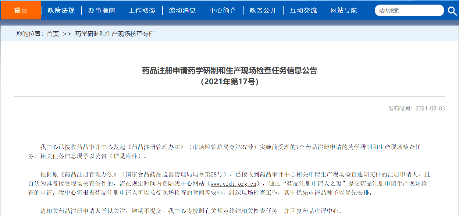 藥品注冊(cè)申請(qǐng)藥學(xué)研制和生產(chǎn)現(xiàn)場檢查任務(wù)信息公告(2021年第17號(hào))