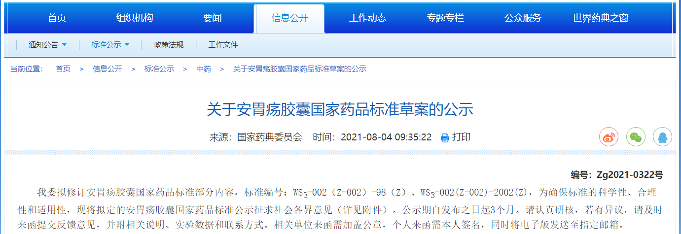 關(guān)于安胃瘍膠囊國家藥品標(biāo)準(zhǔn)草案的公示