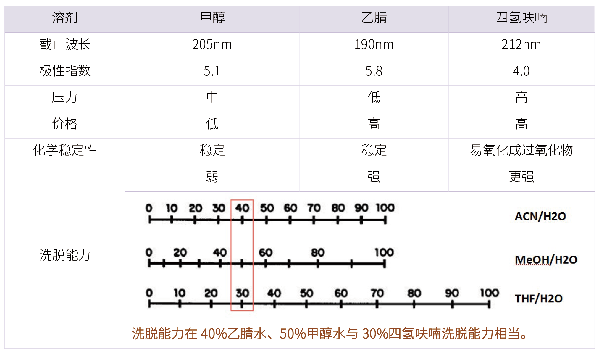 反相體系下,常用的洗脫劑為甲醇、乙腈與四氫呋喃。三種溶劑對(duì)比如下:
