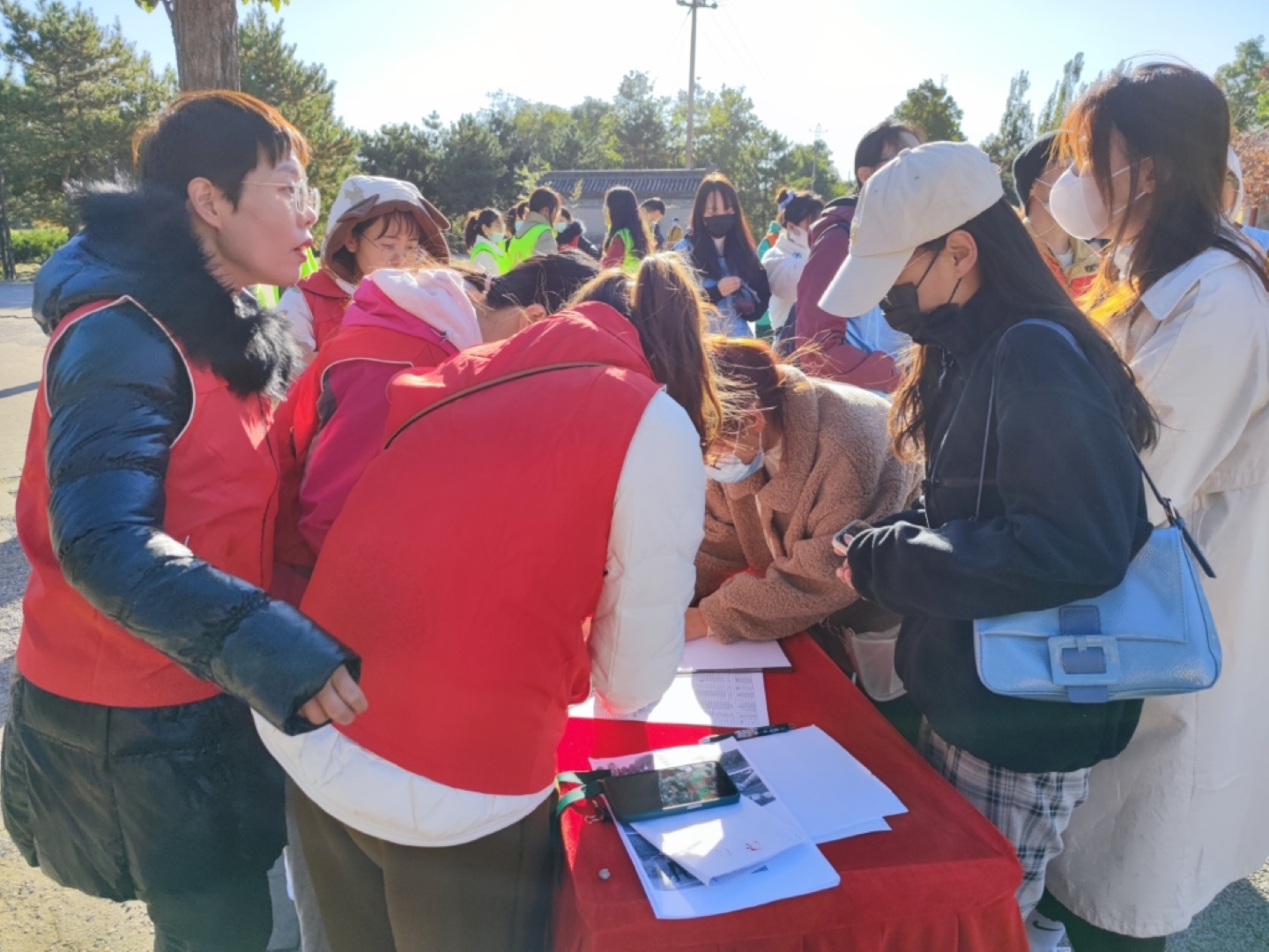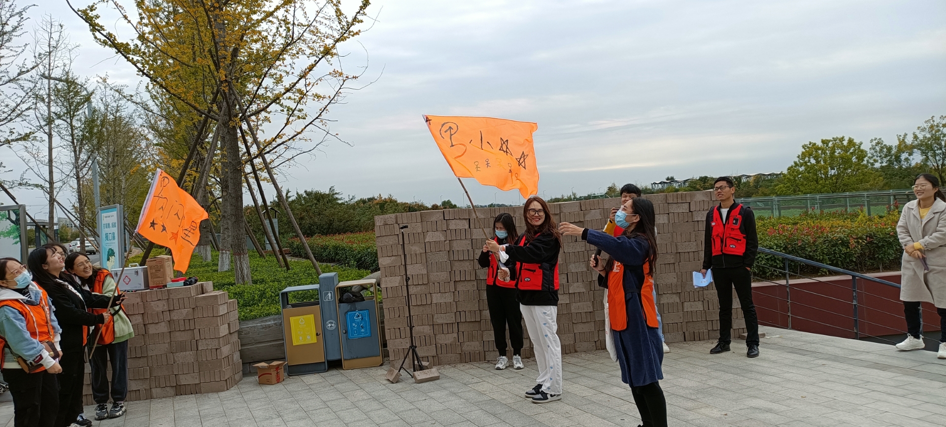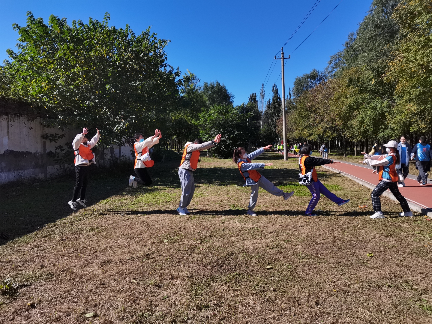 ▲各隊(duì)隊(duì)員高舉隊(duì)旗,耳聽秋風(fēng),腳踩落葉,有說(shuō)有笑,相伴同行