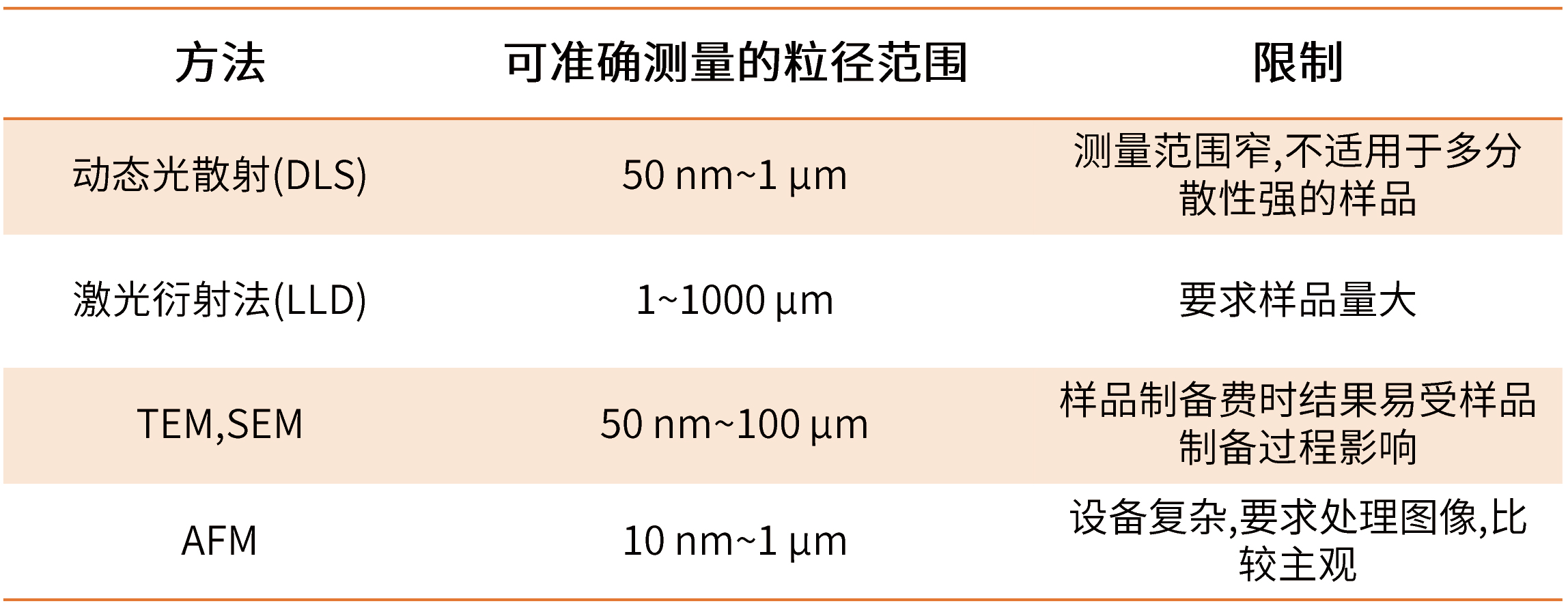 粒徑及粒徑分布是影響微球制劑釋放行為的關(guān)鍵因素,其對(duì)緩釋微球的包封率、釋放行為模式、降解速率都有一定影響,因此粒徑大小及分布是質(zhì)量控制中一個(gè)很重要的指標(biāo)。隨著檢測(cè)手段的進(jìn)步,粒徑大小及其分布測(cè)定由傳統(tǒng)的光學(xué)顯微鏡視野測(cè)定發(fā)展到電子顯微鏡的逐一統(tǒng)計(jì)再發(fā)展到近年來應(yīng)用廣泛的激光粒度儀繪制粒徑大小分布圖,可以在制備過程中的每一步工藝?yán)飳?duì)粒徑大小及分布進(jìn)行追蹤檢測(cè)進(jìn)而得到目標(biāo)微球,表1介紹了各種方法的特點(diǎn)。