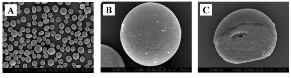 通過掃描電子顯微鏡(SEM)或者透射電子顯微鏡(TEM)觀察微球的形態(tài),如形狀(圓形或類圓形)、表面形貌(光滑或粗糙)、骨架結(jié)構(gòu)(多孔或?qū)嵭模▓D1)。理想微球的微觀形態(tài)應(yīng)為圓整球型或橢圓形實(shí)體,形態(tài)飽滿,顆粒的大小應(yīng)盡可能均勻,微球之間無粘連。微球形態(tài)與結(jié)構(gòu)的不同對(duì)微球的載藥量以及釋放行為有顯著影響。表面粗糙的微球易吸附藥物結(jié)晶,往往會(huì)導(dǎo)致高突釋。通過對(duì)微球形態(tài)進(jìn)行觀測(cè),總結(jié)形態(tài)與處方工藝之間的關(guān)系,不但可以對(duì)微球的制備機(jī)理進(jìn)行探索,還可以對(duì)釋放行為進(jìn)行優(yōu)化。