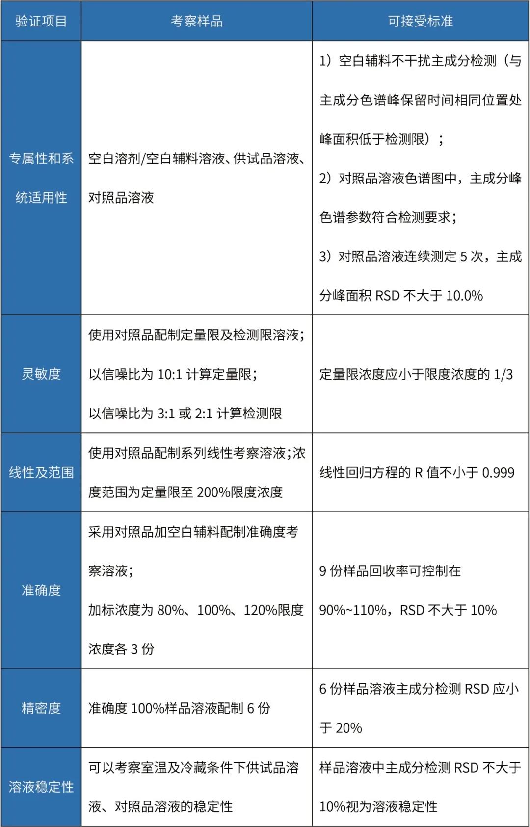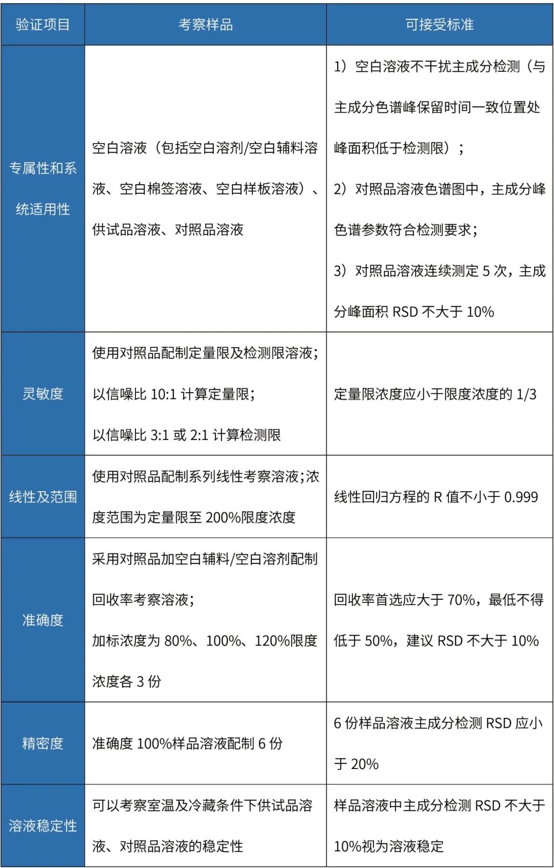 制劑清潔驗(yàn)證分析方法主要驗(yàn)證項(xiàng)目及可接受標(biāo)準(zhǔn)如下:
