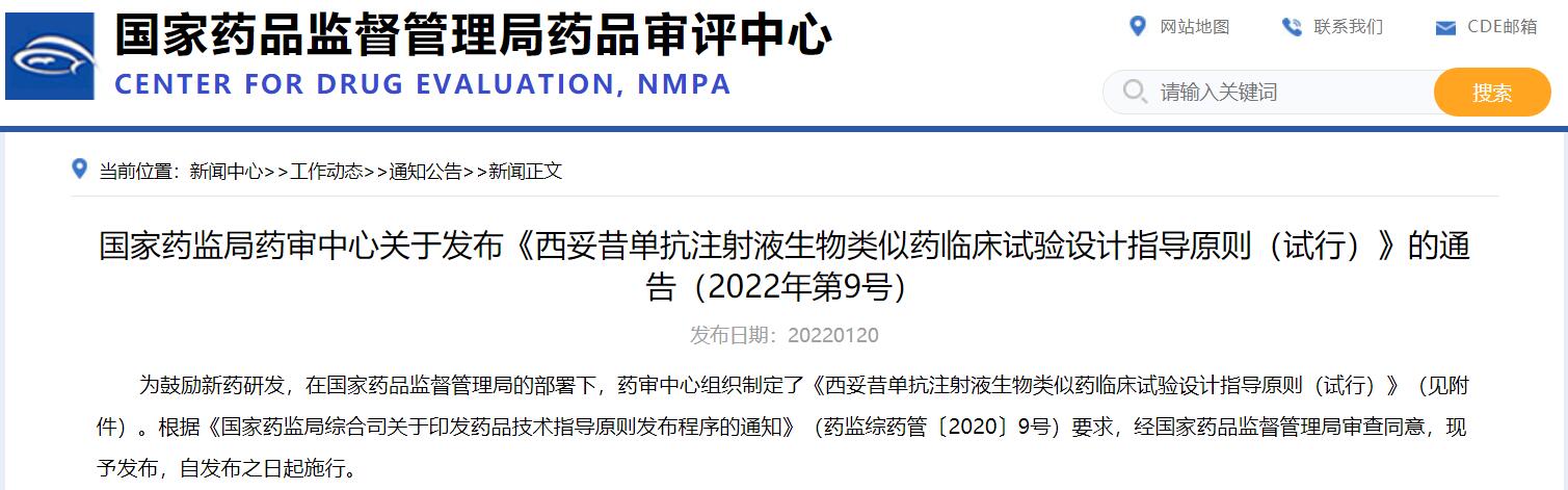 國家藥監(jiān)局藥審中心關于發(fā)布《西妥昔單抗注射液生物類似藥臨床試驗設計指導原則(試行)》的通告(2022年第9號)