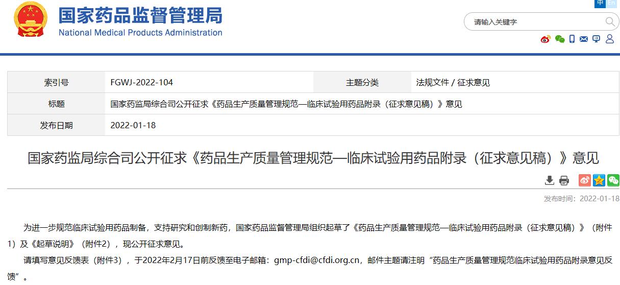 國家藥監(jiān)局綜合司公開征求《藥品生產(chǎn)質(zhì)量管理規(guī)范—臨床試驗用藥品附錄(征求意見稿)》意見