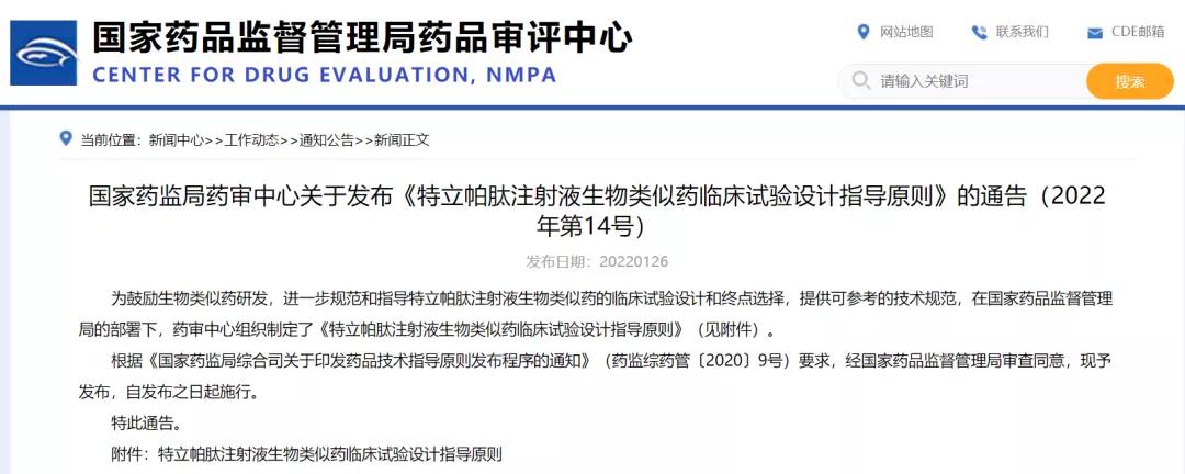 國家藥監(jiān)局藥審中心關(guān)于發(fā)布《特立帕肽注射液生物類似藥臨床試驗(yàn)設(shè)計指導(dǎo)原則》的通告(2022年第14號)