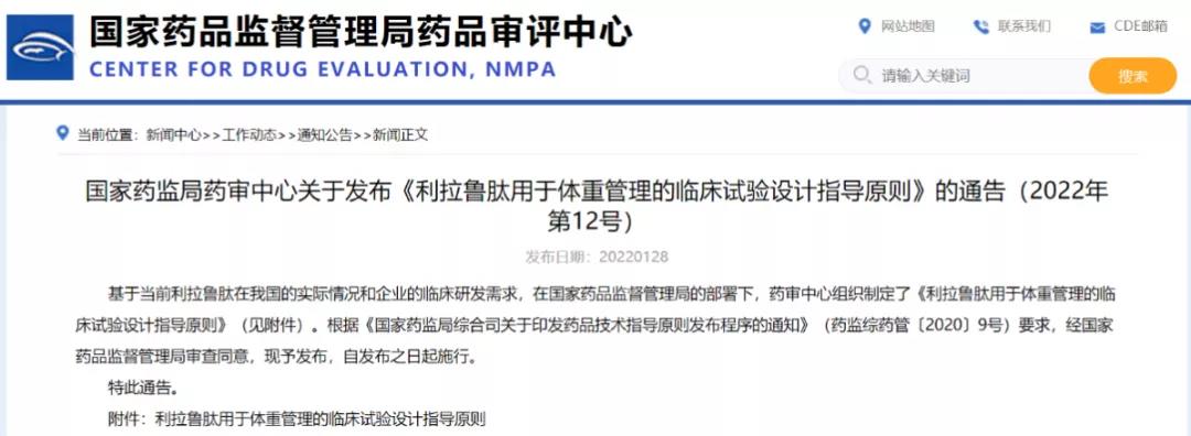 國家藥監(jiān)局藥審中心關(guān)于發(fā)布《利拉魯肽用于體重管理的臨床試驗(yàn)設(shè)計指導(dǎo)原則》的通告(2022年第12號)