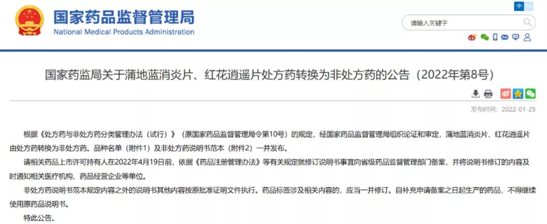 國家藥監(jiān)局關(guān)于蒲地藍(lán)消炎片、紅花逍遙片處方藥轉(zhuǎn)換為非處方藥的公告(2022年第8號)