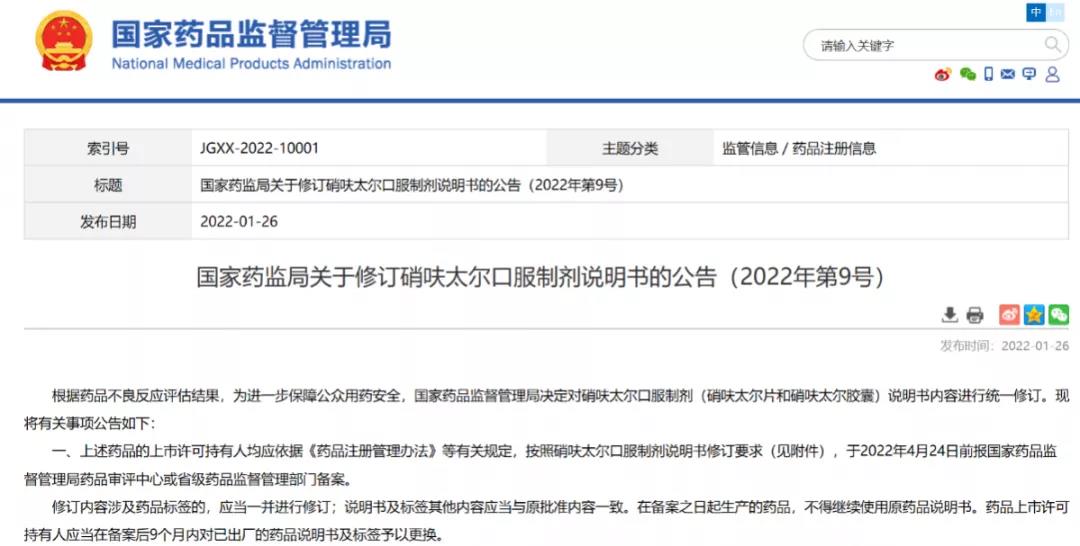 國家藥監(jiān)局關(guān)于修訂硝呋太爾口服制劑說明書的公告(2022年第9號)