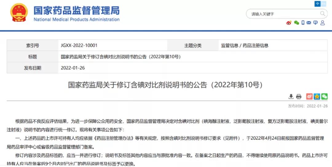 國家藥監(jiān)局關(guān)于修訂含碘對比劑說明書的公告(2022年第10號)