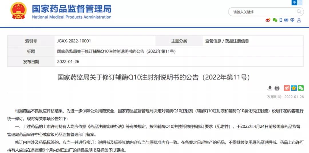 國家藥監(jiān)局關(guān)于修訂輔酶Q10注射劑說明書的公告(2022年第11號)