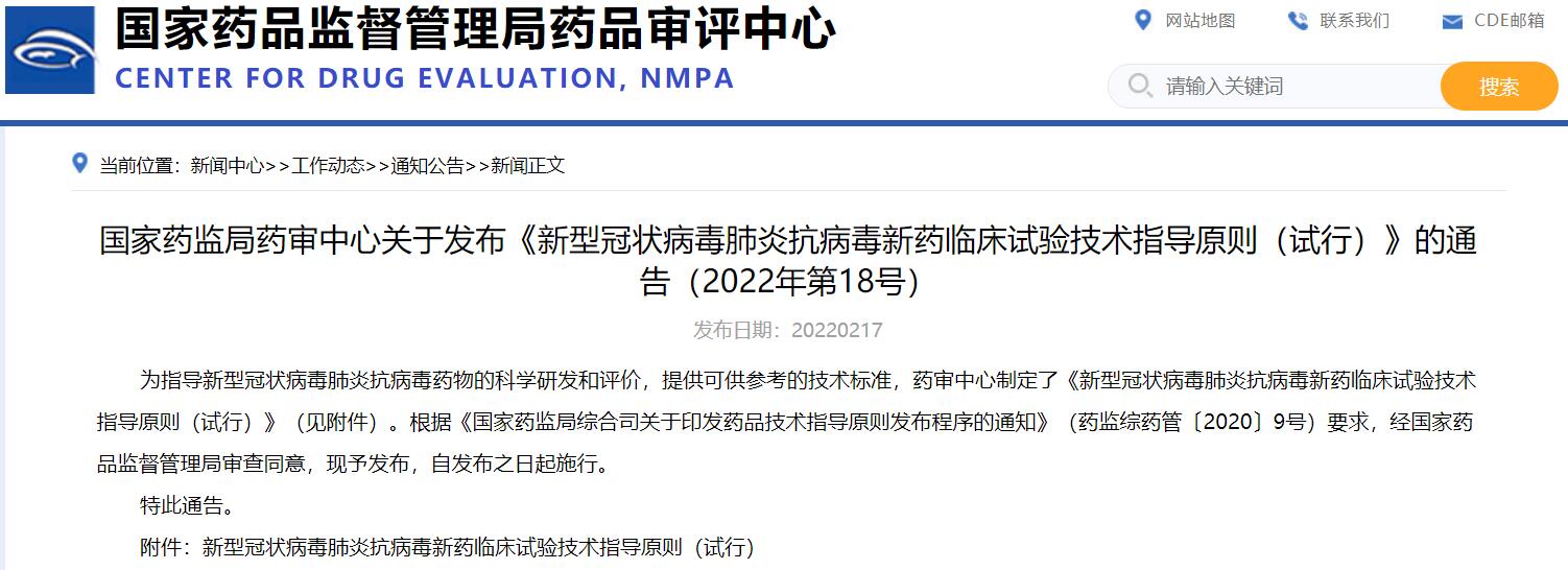 國家藥監(jiān)局藥審中心關(guān)于發(fā)布《新型冠狀病毒肺炎抗病毒新藥臨床試驗技術(shù)指導(dǎo)原則(試行)》的通告(2022年第18號)