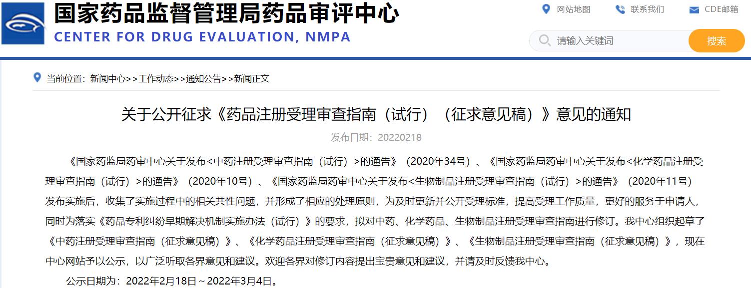 關(guān)于公開征求《藥品注冊受理審查指南(試行)(征求意見稿)》意見的通知