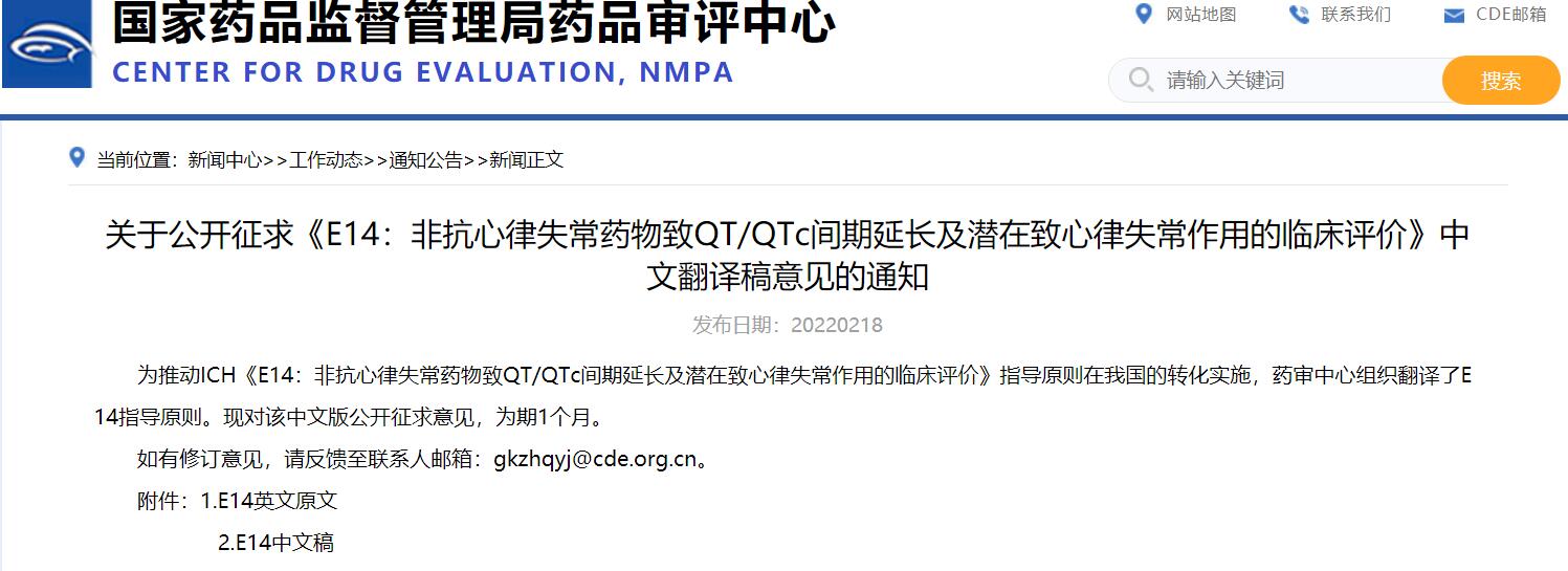 關(guān)于公開征求《E14:非抗心律失常藥物致QT/QTc間期延長及潛在致心律失常作用的臨床評價》中文翻譯稿意見的通知