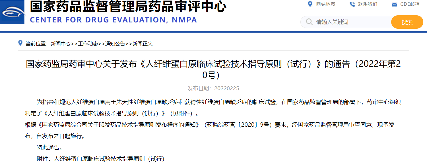 國家藥監(jiān)局藥審中心關(guān)于發(fā)布《人纖維蛋白原臨床試驗(yàn)技術(shù)指導(dǎo)原則(試行)》的通告(2022年第20號)