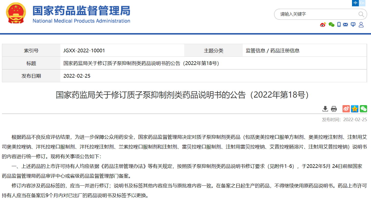 國家藥監(jiān)局關(guān)于修訂質(zhì)子泵抑制劑類藥品說明書的公告(2022年第18號)
