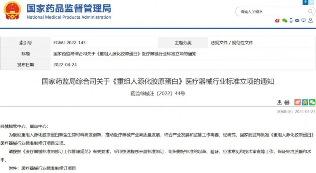 國家藥監(jiān)局綜合司關于《重組人源化膠原蛋白》醫(yī)療器械行業(yè)標準立項的通知