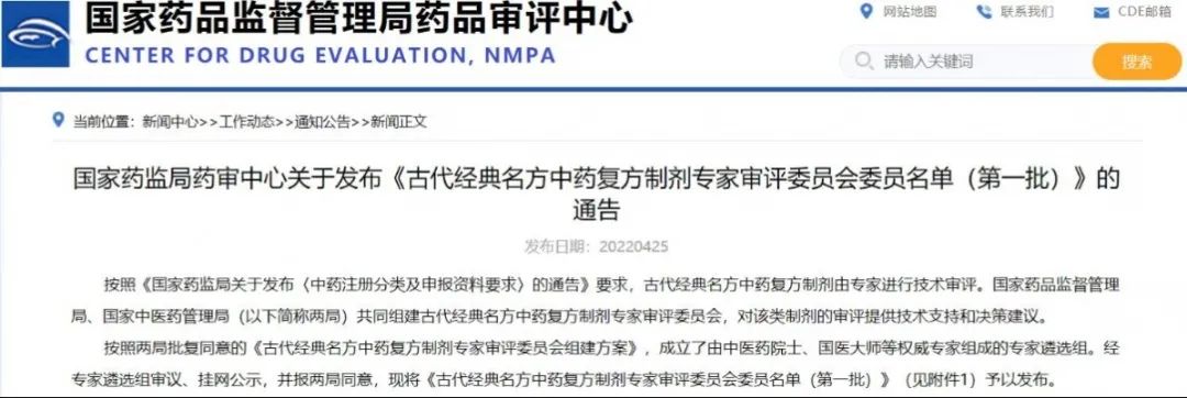國家藥監(jiān)局藥審中心關于發(fā)布《古代經(jīng)典名方中藥復方制劑專家審評委員會委員名單(第一批)》的通告