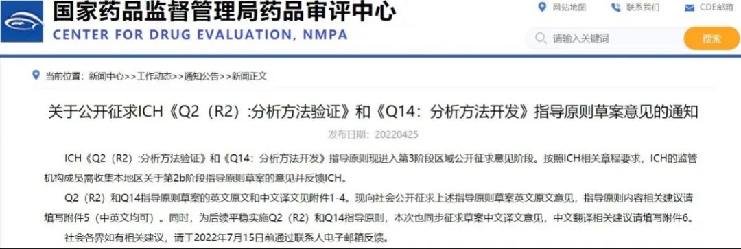 關于公開征求ICH《Q2(R2):分析方法驗證》和《Q14:分析方法開發(fā)》指導原則草案意見的通知