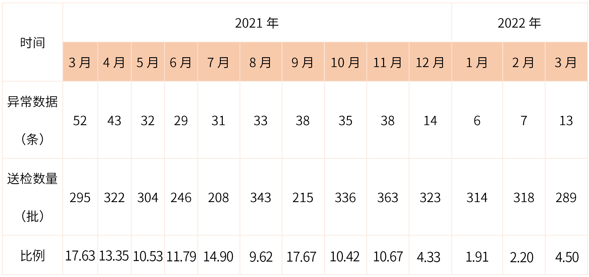 通過該工作方式,實(shí)驗(yàn)過程中數(shù)據(jù)的完整性、現(xiàn)場的合規(guī)性得到了很大的提高。現(xiàn)以該公司2021年3月~2022年3月的異常數(shù)據(jù)指標(biāo)為例進(jìn)行效果分析。