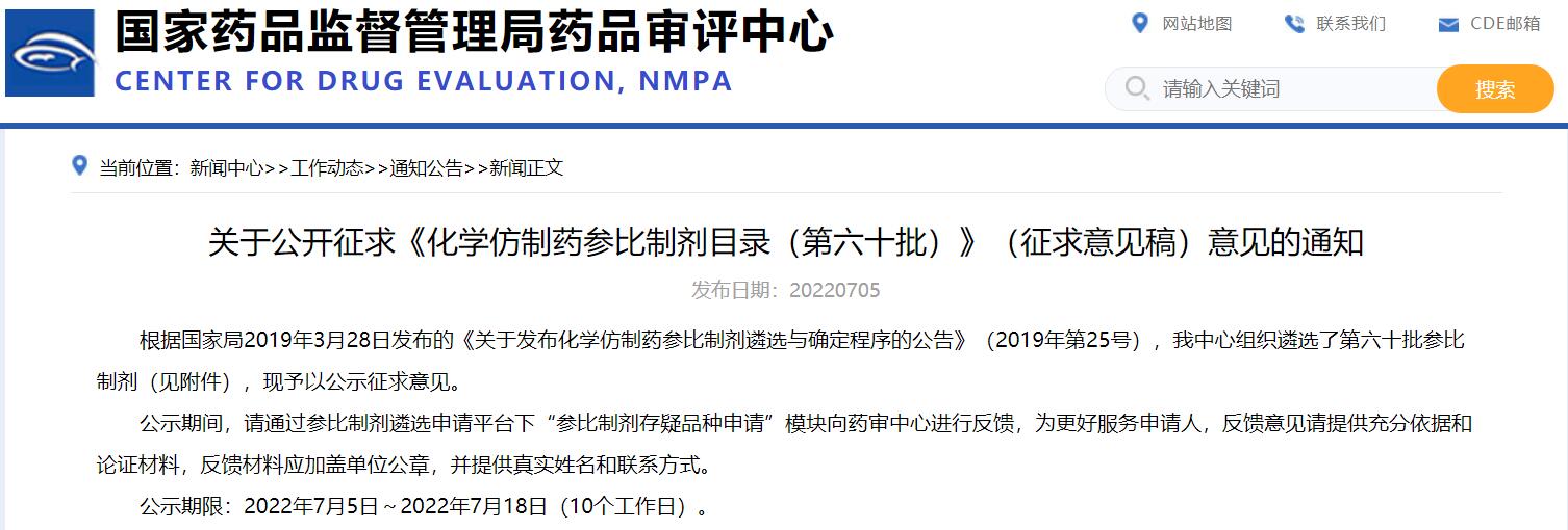 《化學(xué)仿制藥參比制劑目錄(第六十批)》(征求意見稿)