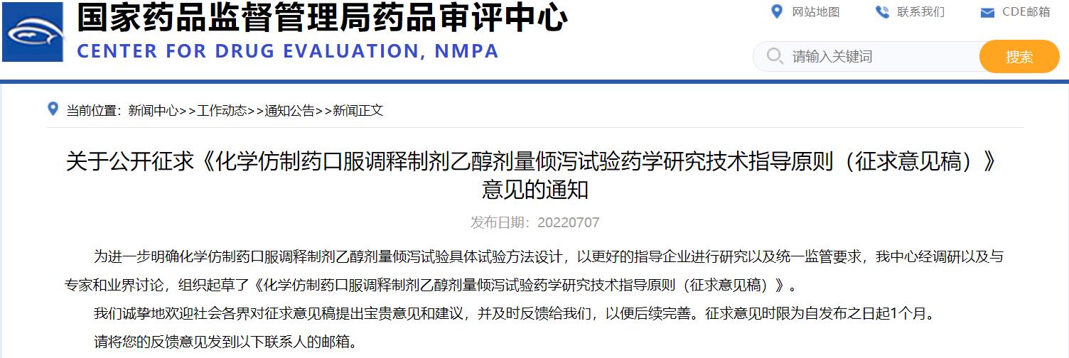關(guān)于公開征求《化學(xué)仿制藥口服調(diào)釋制劑乙醇劑量傾瀉試驗藥學(xué)研究技術(shù)指導(dǎo)原則(征求意見稿)》意見的通知