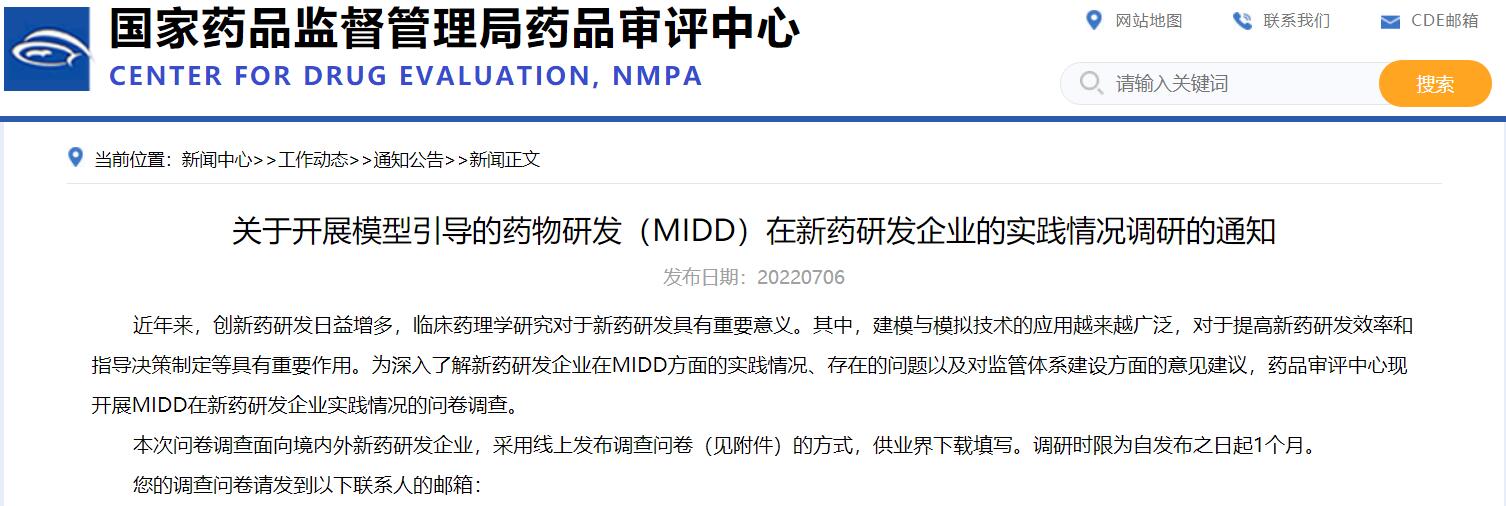 關(guān)于開展模型引導(dǎo)的藥物研發(fā)(MIDD)在新藥研發(fā)企業(yè)的實踐情況調(diào)研的通知