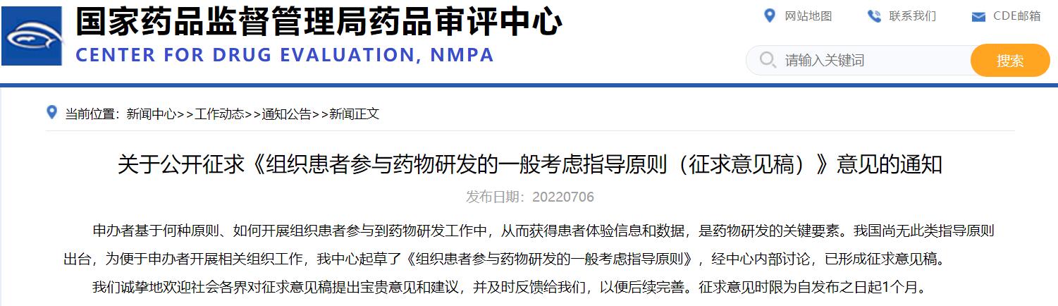 關(guān)于公開征求《組織患者參與藥物研發(fā)的一般考慮指導(dǎo)原則(征求意見稿)》意見的通知