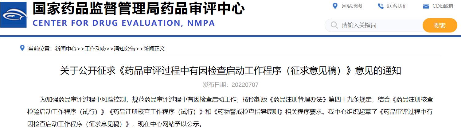 關(guān)于公開征求《藥品審評過程中有因檢查啟動工作程序(征求意見稿)》意見的通知