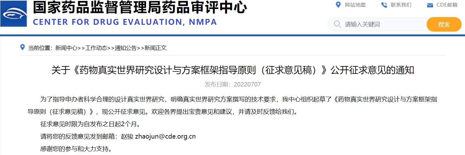 關(guān)于《藥物真實世界研究設(shè)計與方案框架指導(dǎo)原則(征求意見稿)》公開征求意見的通知