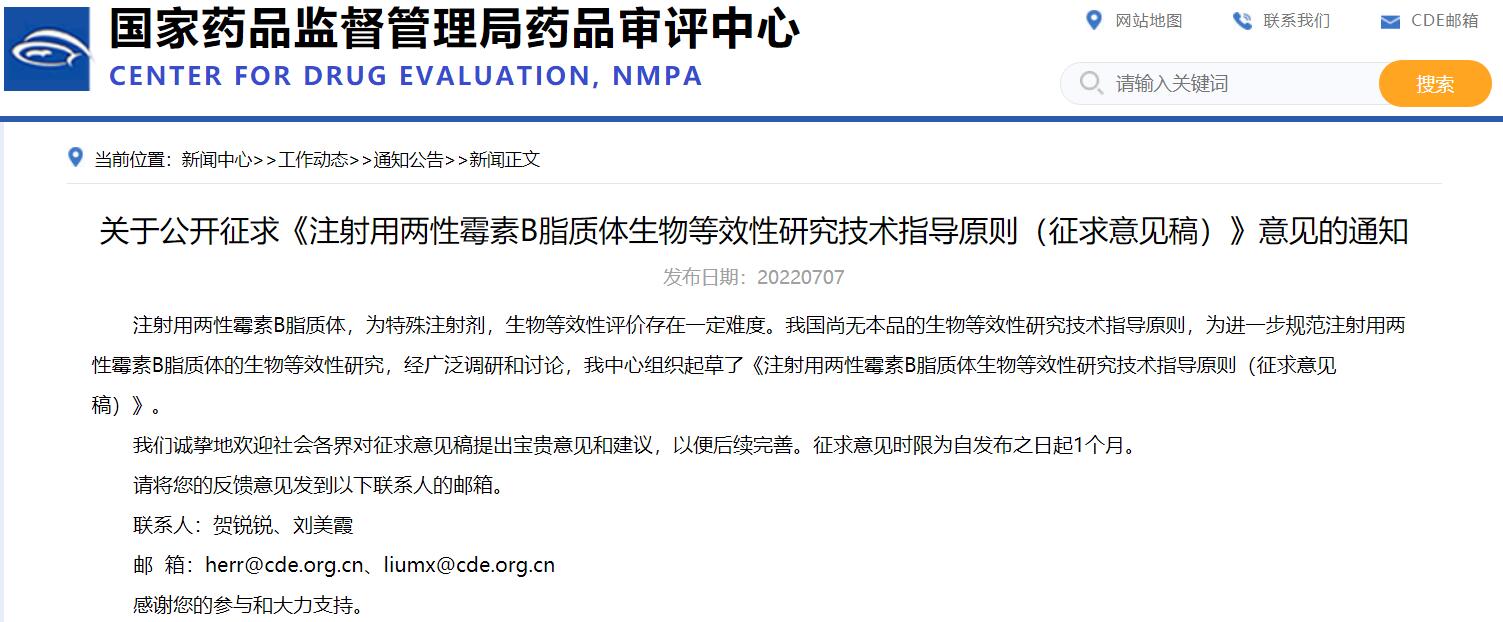 關(guān)于公開征求《注射用兩性霉素B脂質(zhì)體生物等效性研究技術(shù)指導(dǎo)原則(征求意見稿)》意見的通知