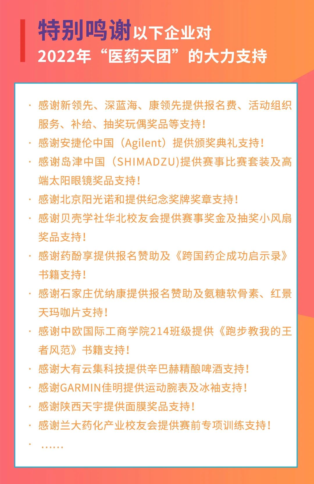 “醫(yī)藥天團”發(fā)起兩年來,受到了越來越多的企業(yè)關(guān)注和支持,從服裝、補給、運動裝備、獎牌、暢飲酒水等全方位的贊助支持。在此,我們對所有的贊助商表示誠摯的感謝!